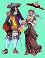 шарф, отделанный по краю кружевом. Шпагу поддерживает широкая перевязь. Штаны