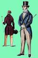 сюртук длинный, обуженный в талии, застегивается на пуговицы, фалды доходят до